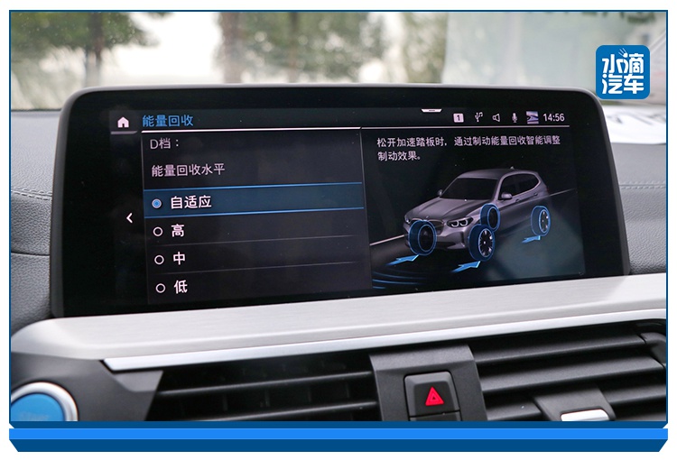 iX3的动能回收除了高中低三个挡位外,还增加了一个自适应,在这个挡位下,能量回收的力度或者说车辆在松开电门后制动的力度,会根据车速的快慢和前车的距离进行自动调节。如果距前车较近,回收制动力度会变强,而如果前方没车,那系统就会让车辆滑行得更远一点,这相当于一项非常智能化的主动刹车辅助功能,而且系统对于回收力度的拿捏也是恰到好处,不会给车内乘员带来任何突兀感。