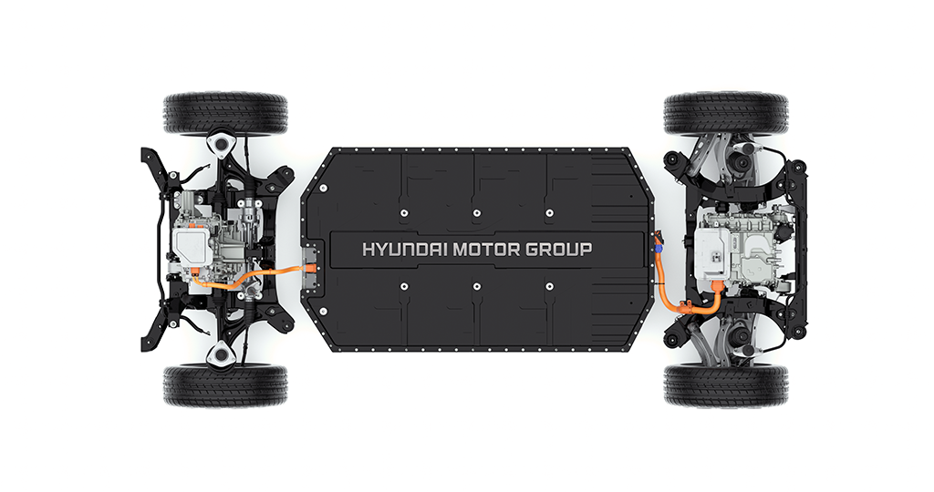 在传统内燃机汽车中,引擎占据了较大的空间。而在E-GMP平台中,在原有安装引擎的位置搭载了轻量化的驱动电机,将电池安装在车身中央下端,实现了低重心设计与车体前后重量的合理分配,打造了卓越的转弯性能及稳定的高速行驶性能。