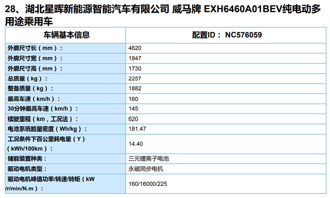 在这一批次中,已经上市了的高合HiPhi X带来了长续航版本的车型,其搭载94kWh容量的三元锂离子电池包,能量密度为180.83Wh/kg,NEDC续航为630km。动力部分,新车搭载一台最大功率200kW,峰值扭矩348N·m的永磁同步电机。