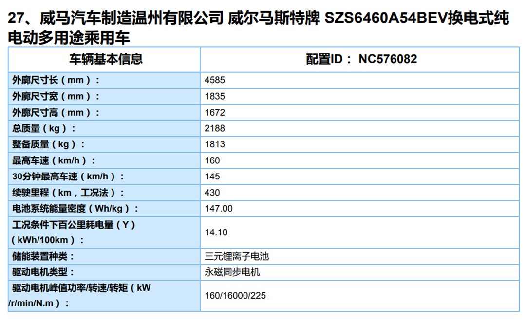 新车将搭载55kWh容量的三元锂离子电池包,能量密度为147Wh/kg,NEDC续航为430km。动力部分,新车搭载一台最大功率160kW,峰值扭矩225N·m的永磁同步电机。