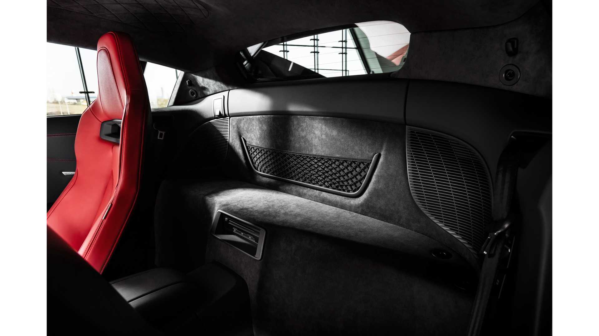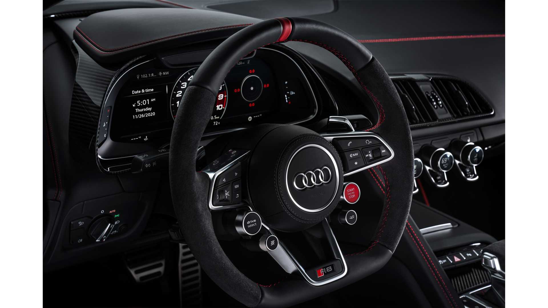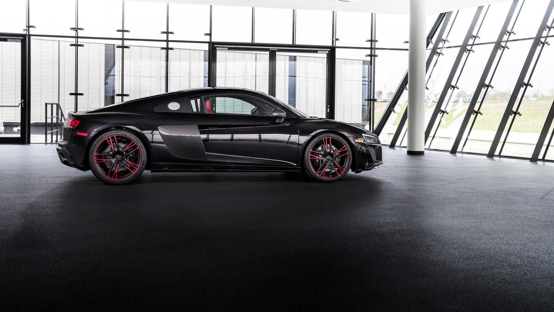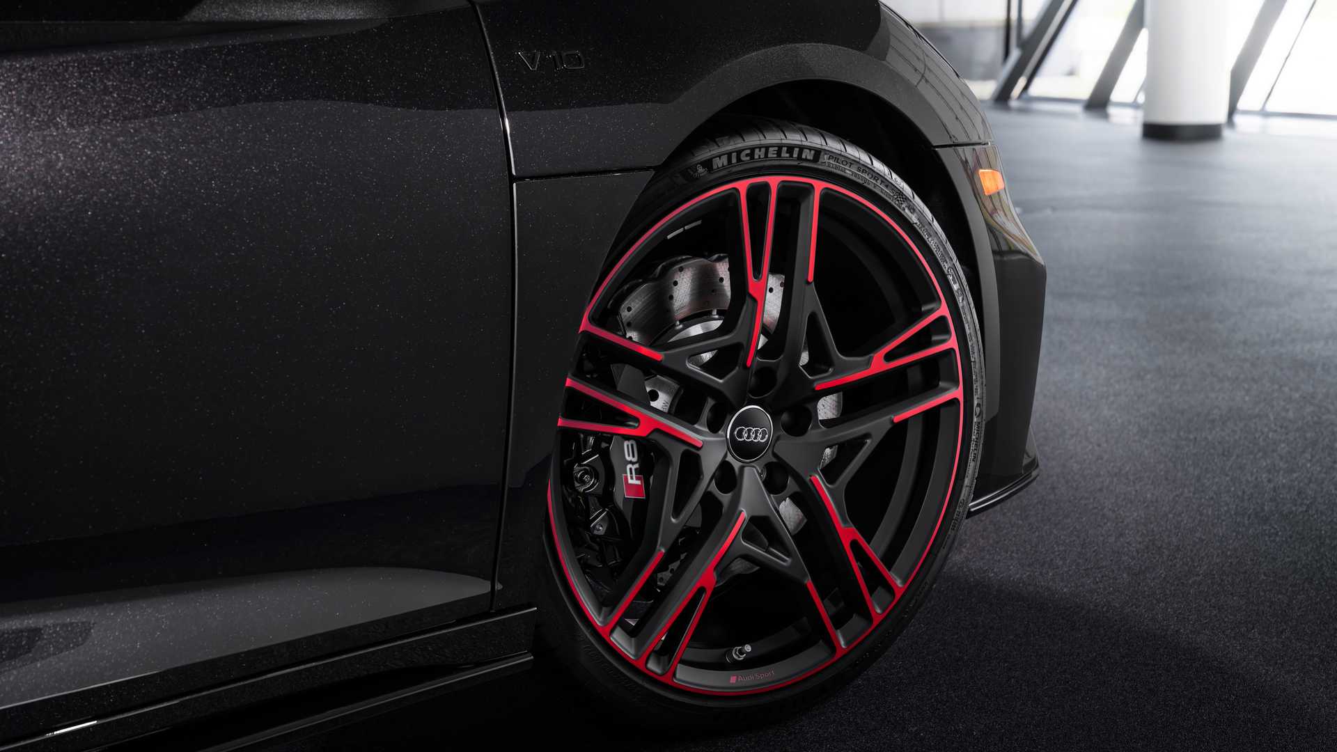 R8 RWD Panther特别版除了深色的车身漆之外,还有更多的特点,奥迪为其自然吸气发动机增添了红色的点缀,内部的缝线和Crimson Red Nappa真皮内饰也延续了这种对比色。即使是花哨的地垫也有红色的边框,而其他所有的东西都是黑色或碳纤维的。