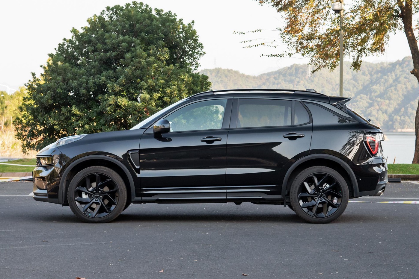车身侧面造型和老款车型基本保持一致,车顶采用了与车身不同色的双色设计,使用隐藏式的A/B柱设计。车身尺寸上,长宽高分别为4549/1860/1689mm,轴距为2734mm,相比老款车型,长度加长37mm,高度增加3mm。还有一个变化是,四驱暗夜版身上使用了新增的20英寸花瓣式双五辐轮圈,采用了黑色处理,而此前领克01最大的轮毂标号为19英寸。