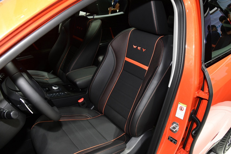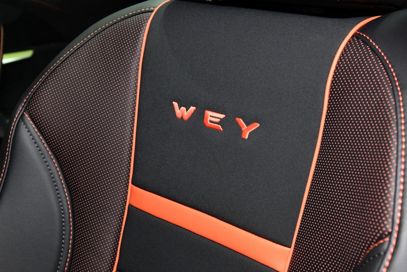 新车座椅和老款材质一样,采用了仿皮材质,但是使用了撞色设计,并加入了橙色缝线,座椅后背"WEY"三个字体也采用了橙色缝线处理,增加了一丝辨识度和运动感。