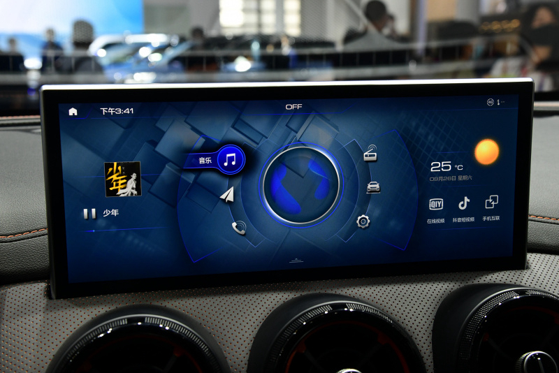中控区域配备了一块12.3英寸悬浮式触控液晶显示大屏,屏幕边框非常窄,看起来更加修长,车机界面UI设计也比较简洁清晰,具备:GPS导航、路况显示、语言识别控制系统、车联网、OTA升级等功能,操作上既支持触控也可用地台处上的机械按钮。