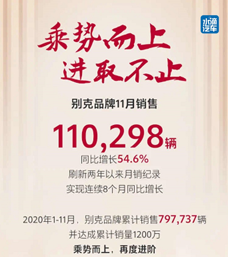“别克品牌11月销售110298辆。”在12月的第一天,别克汽车便在其官微中推送出一幅硕大的“2020年11月销量海报”。