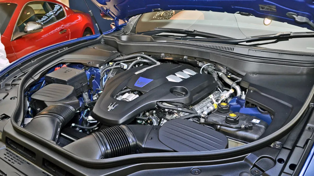 为了实现如此强悍的动力输出,玛莎拉蒂给这台发动机配上了两颗带有电控泄压阀的涡轮增压器、350bar缸内直喷+6bar歧管喷射、干式油底壳等配置。更重要的是,海神发动机拥有民用车里非常罕见的双燃烧室设计,为此也特意使用了双火花塞的结构。简单来说,双燃烧室就是在主气缸燃烧做功之前,先给副燃烧室喷油点火,随后将副燃烧室产生的火焰直接喷入主气缸内,让主气缸的燃烧更迅速、更充分。在提升动力的同时,还能减少污染物排放,满足最为严苛的欧6D以及国6B排放标准。