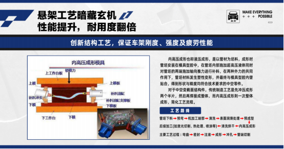 从技术方面解读,BJ40底盘采用了与冲压焊接工艺相比更为优异的内高压成形工艺,在减轻产品质量的同时,还能够节约材料、提升原材料利用率。此外,内高压成形工艺能够减少后续机加、焊接与组装工序,提高部件及总成强度与刚度,尤其是疲劳强度。