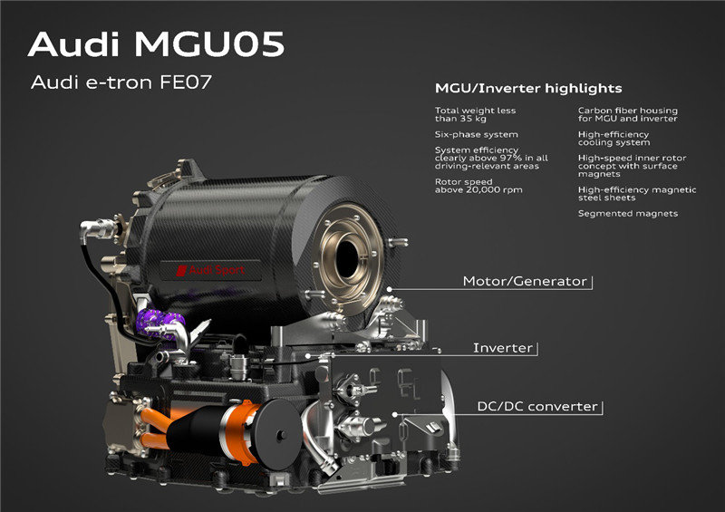 新车搭载完全由奥迪自主研发的全新电机——MGU05,在正常比赛规则下,最大功率为200kW,在“ATTACK MODE”模式和“FANBOOST”模式下最大功率可达235kW和250kW,但250kW并不是这款电机的最高上限。