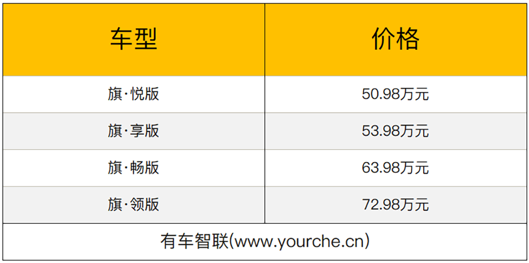 12月4日,红旗E-HS9 (配置|询价)正式上市,新车共推出4款车型,官方指导售价区间为50.98万-72.98万元。此外,购车消费者还可以享受到4年10万公里免费保养、终身免费保修、终身免费救援等服务政策。