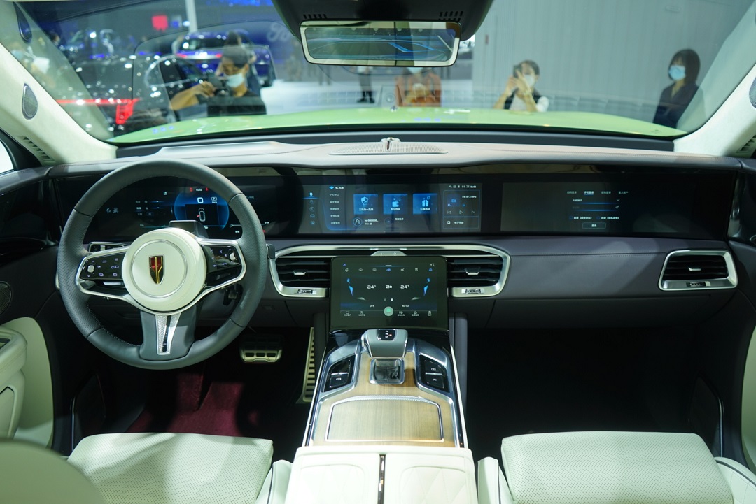 内饰方面,横平竖直的线条简约又不失设计感,中控台、门板等位置上双缝线的皮质包覆,也营造出了高级质感。最为瞩目的是嵌入在中控台的屏幕,从主驾前方的全液晶仪表,到中间的中控屏,再到副驾驶前方的娱乐屏,三屏相连贯穿整个中控台。中控屏还搭载新一代红旗智联系统。在“T”字区,还有一块控制空调及座椅的第四块屏幕。另外,在顶配车型上,后排除了两块娱乐屏幕外,中央扶手上也将配备有一块控制屏幕,整车最多将配备有7块屏幕。