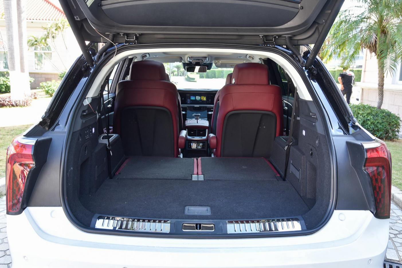 在三排座椅全部启用的情况下,后备厢内部进深一般,在放倒第三排座椅时,后备厢就足以放下四个人长途出行所需的行李了,地板之下还有一个隐藏储物格,主要用于放置随车工具和充电线等物品。