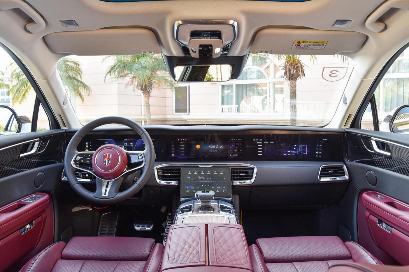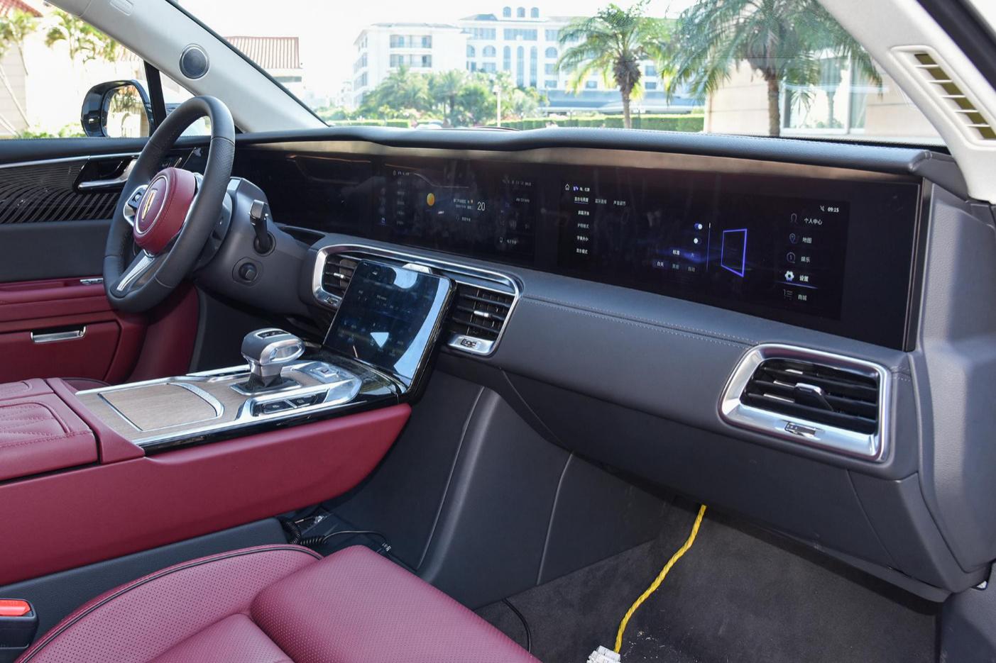 来到内饰,红旗E-HS9同样追求了设计潮流,采用了四屏设计,包括中控台采用了全液晶仪表和中控显示屏组成的一体式贯穿大屏,此外,新车在中控台下方还配备了一块液晶屏,除了提升科技氛围外,这也能让乘客更加轻松,深红色内饰配色也有着一种尊贵的感受。