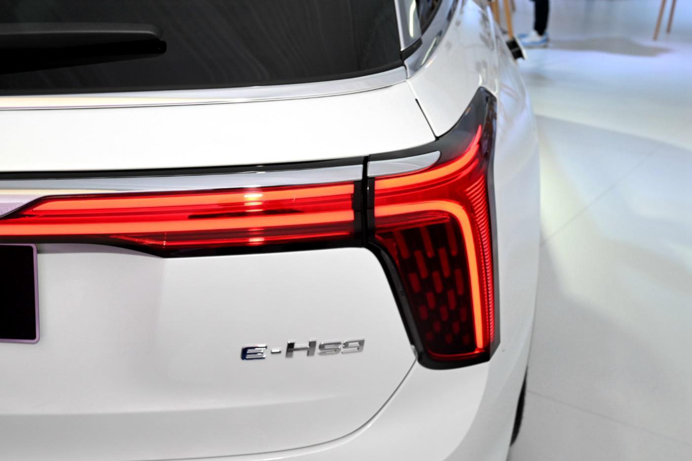 车头直瀑式镀铬装饰条与前脸自然地融为一体,看起来符合纯电动车封闭式前脸的设计取向,同时又保留了红旗品牌家族式的设计特征,比如:前脸中间凸出的红色饰条,两侧前大灯组采用了分体式设计,这个设计和红旗H9类似,官方将其称为"振翅飞翔"的设计语言,同时灯组内部的三条竖状转向灯带可与中网形成呼应。