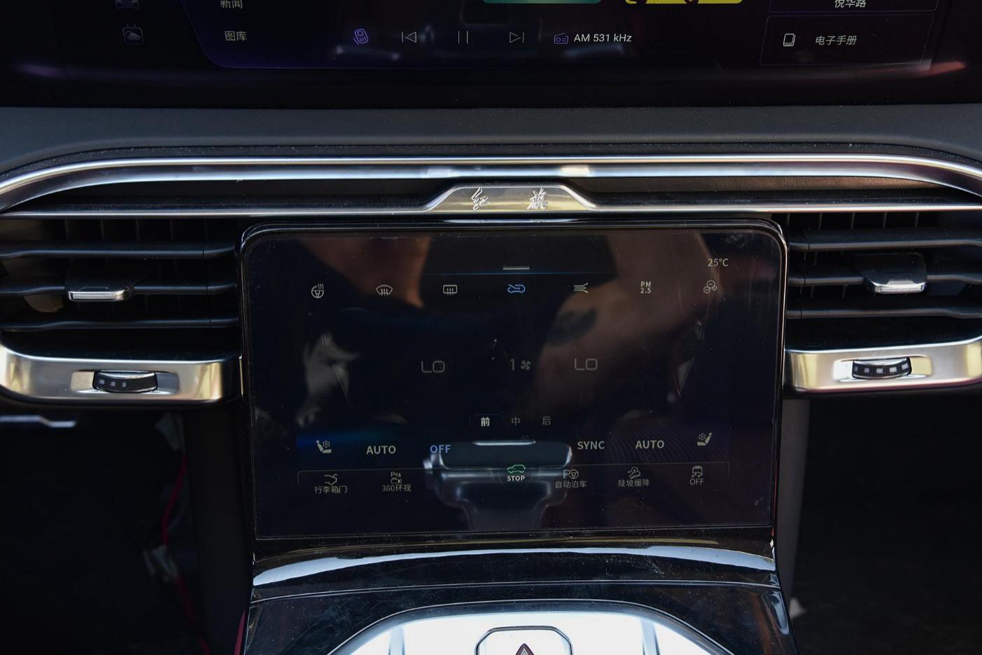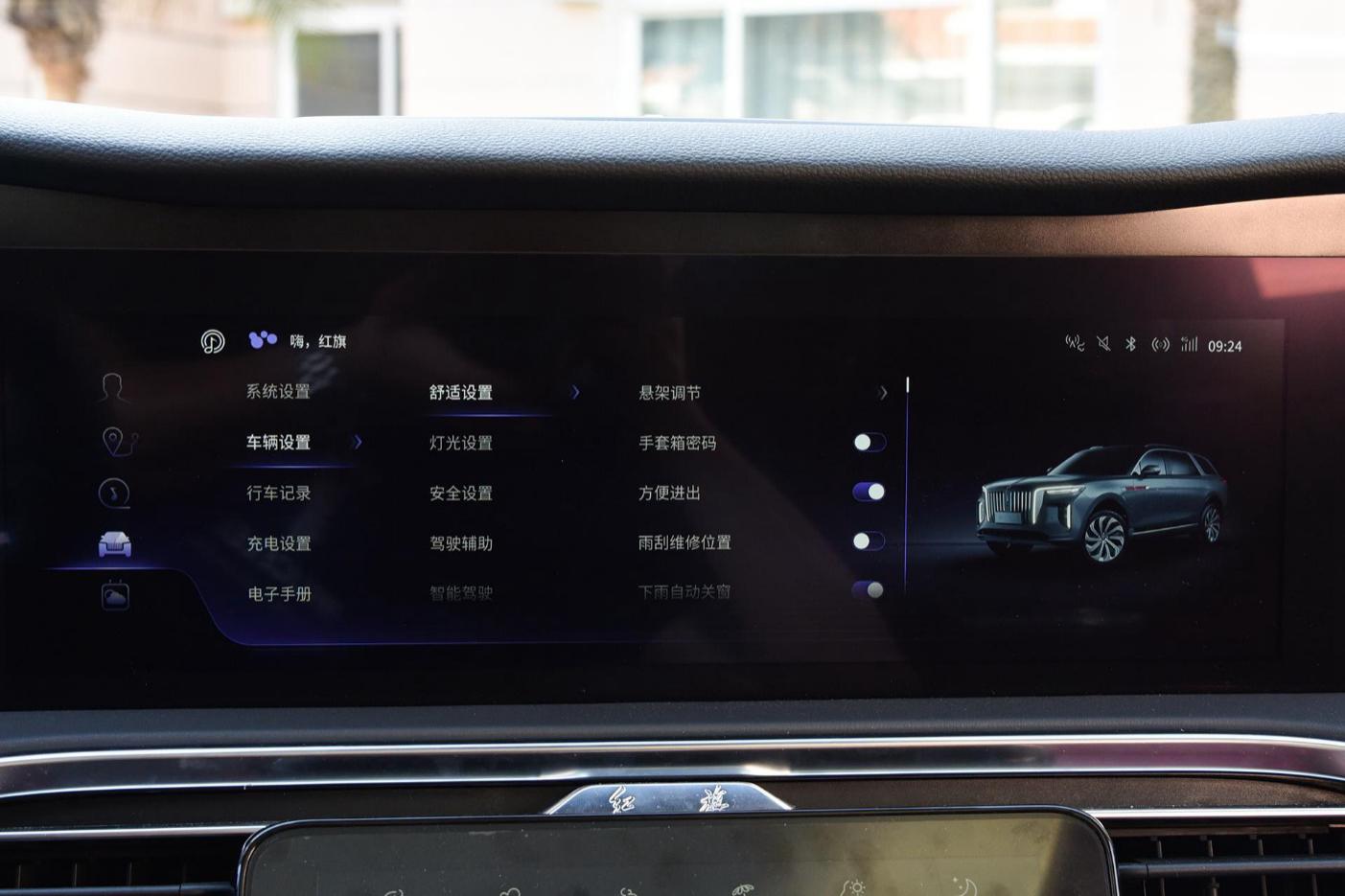 中控区域屏幕可以显示车辆设置、各种开关、个人账户等信息,副驾驶面前的屏幕更多的是显示多媒体娱乐的信息,当然也可以看导航,并且配备了语音控制功能,通过"你好红旗"将其唤醒,车机系统也支持车联网、OTA升级等功能。