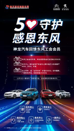 12月5日,主题为“五心守护 感恩东风”的神龙公司回馈东风工会会员启动会于湖北省十堰市隆重举行。在此次大会上神龙公司宣布,将在“五心守护行动”的指导下正式推出一系列重磅的东风工会员工专项购车政策。这是神龙公司历史上规格最高、规模最大、优惠力度最大的区域地推活动,将让广大工会员工能够更便捷,更实惠地享受到兄弟单位生产的良心车、放心车、安全车。