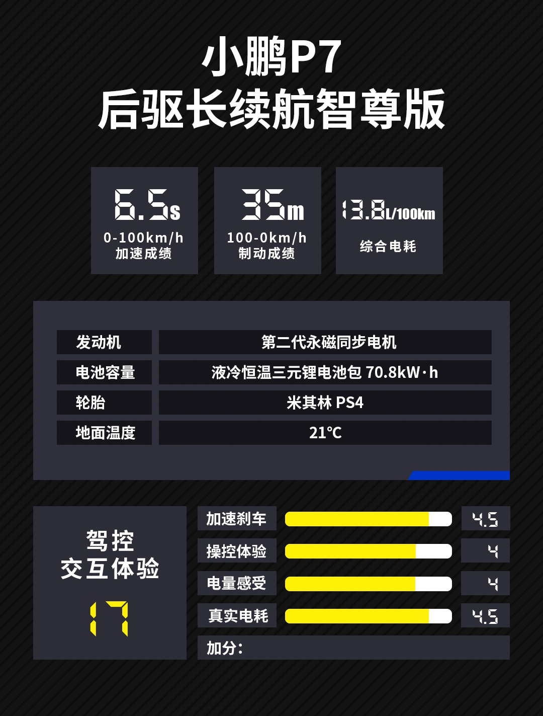在新车交付一段时间后,水滴汽车根据用户调研数据显示,消费者重点关注其驾控乐趣、车内空间以及智能化水平等。基于以上关注点,水滴汽车针对小鹏P7(后驱长续航智尊版)展开了相应测试。
