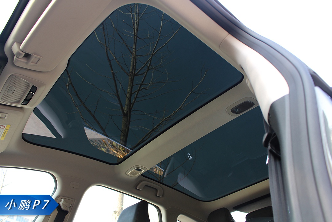 关于全景天幕,采用一整块玻璃,但为了保证车顶强度,小鹏P7将其分为两个部分,中央为加强横梁。