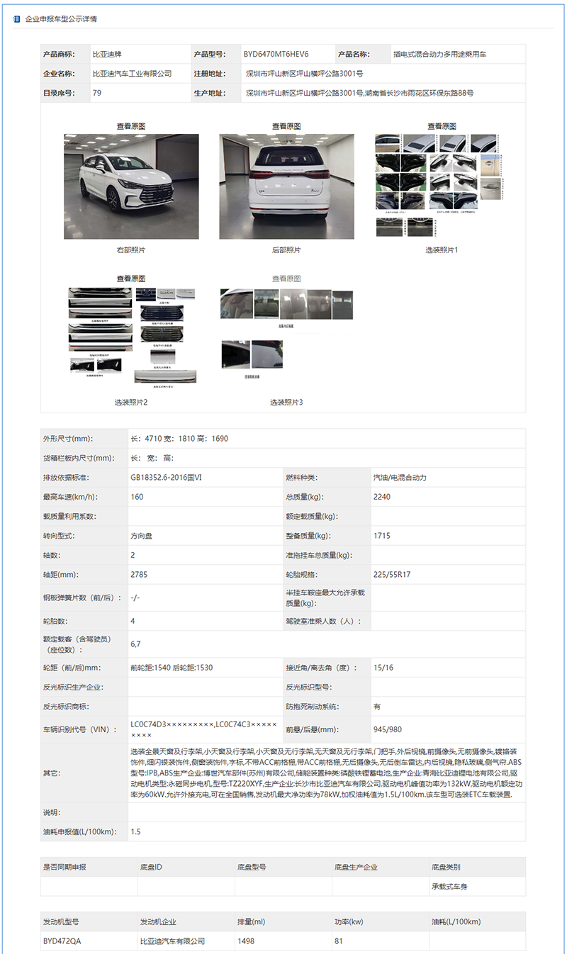 日前,我们获取到了一组有关于新款比亚迪宋MAX DM版车型的申报信息。