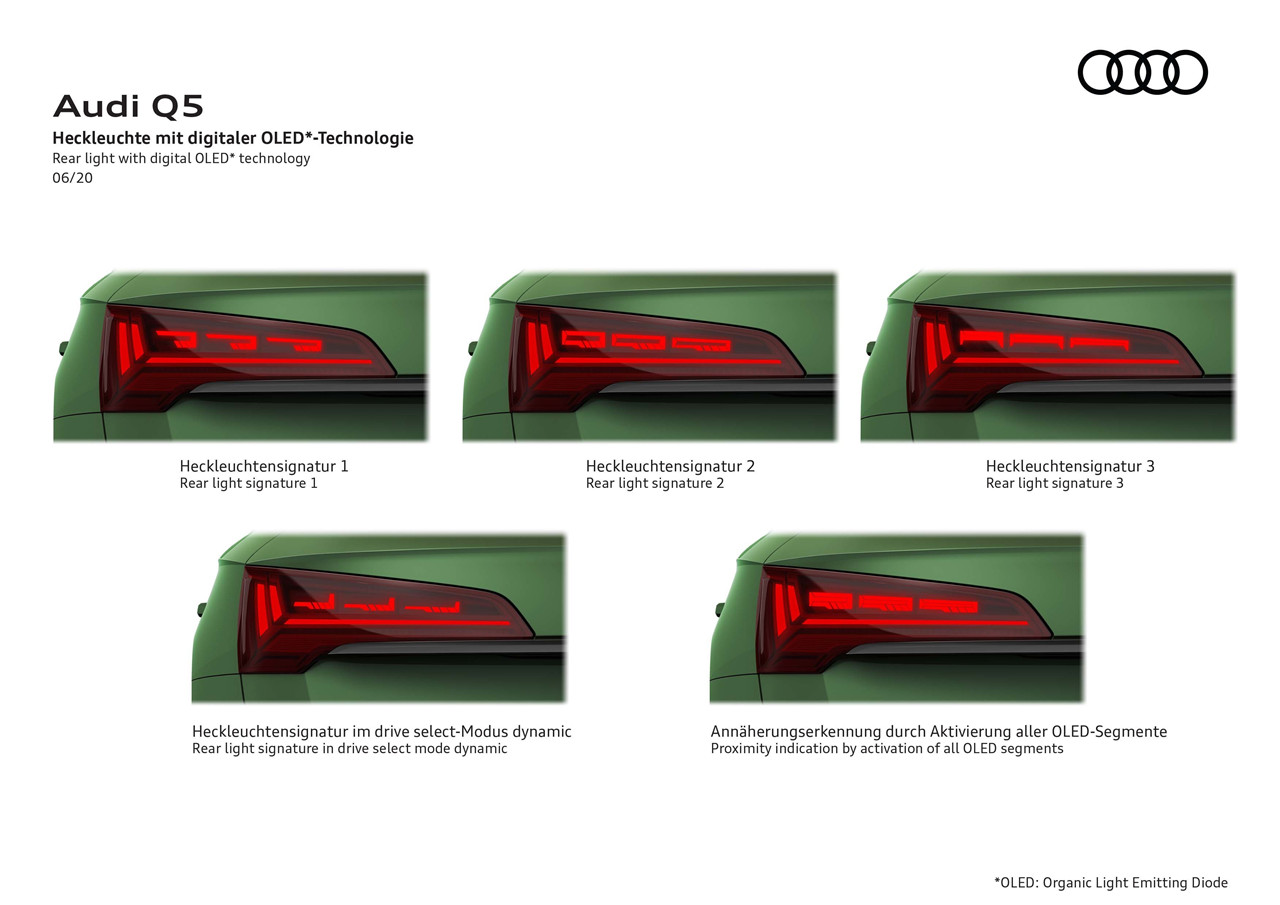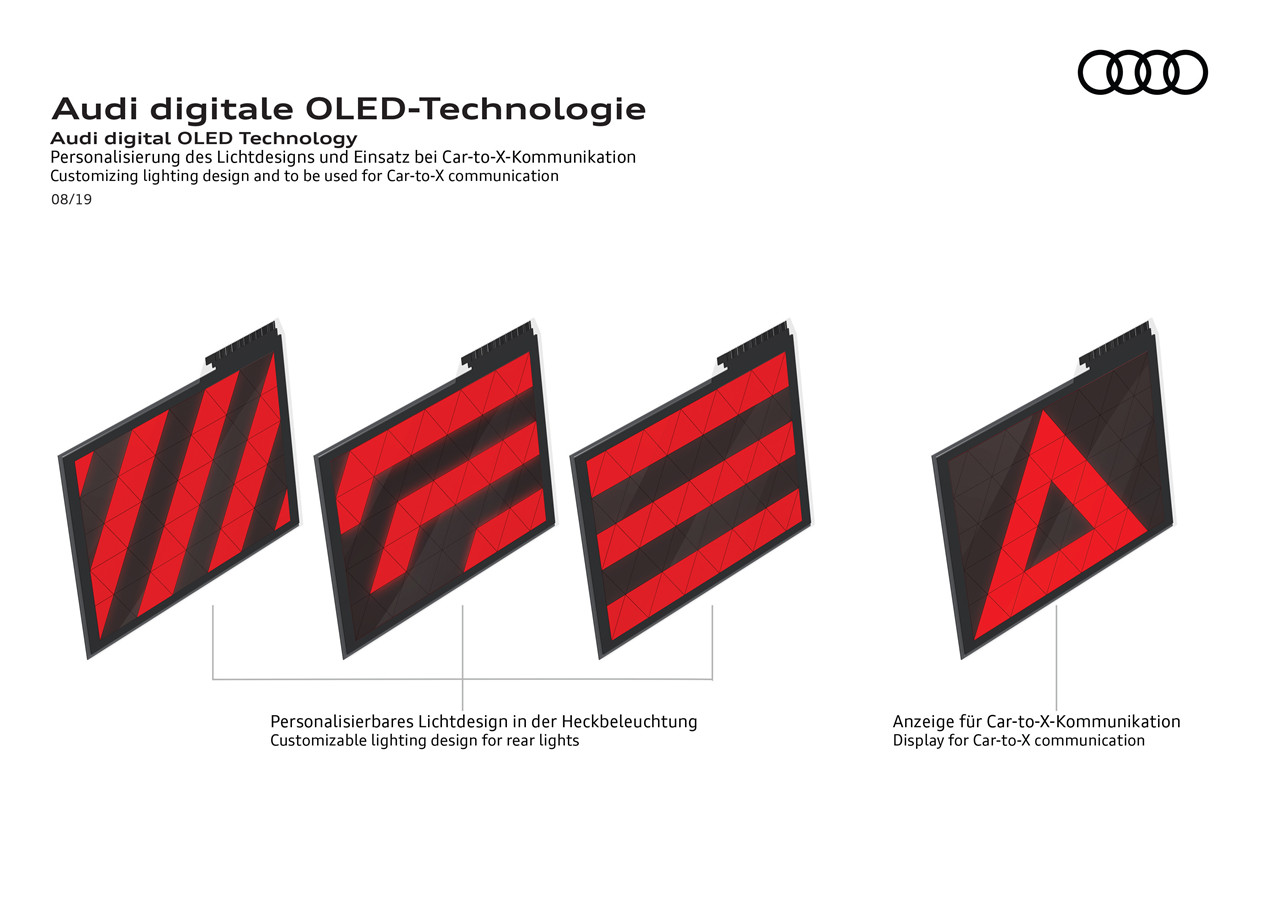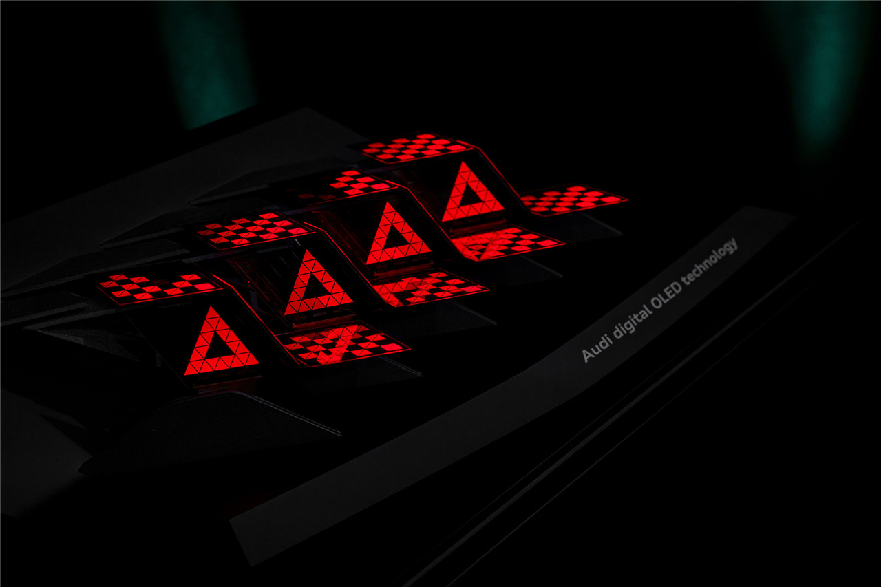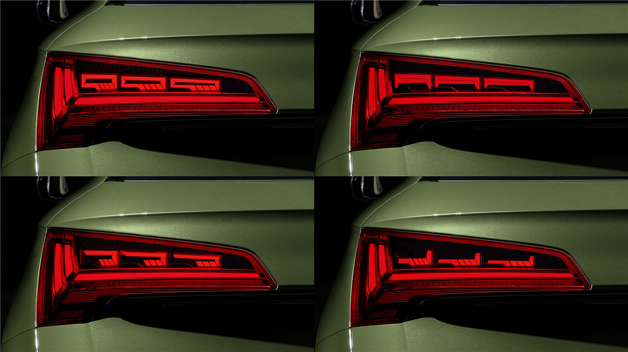 灯厂懂你们的尴尬,先从一个带信号功能的尾灯开始。再往后出厂的奥迪Q5会率先使用一种数字OLED尾灯,这套灯能在三种信号之间选择,还专门为运动模式准备了一种特别的信号,所以当你在MMI系统中让车辆进入“动态”模式的时候,尾灯也会变成相应的特殊图形。往远一点想,既然尾灯点亮形状可以变了,那就可以打暗语了啊。