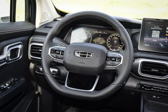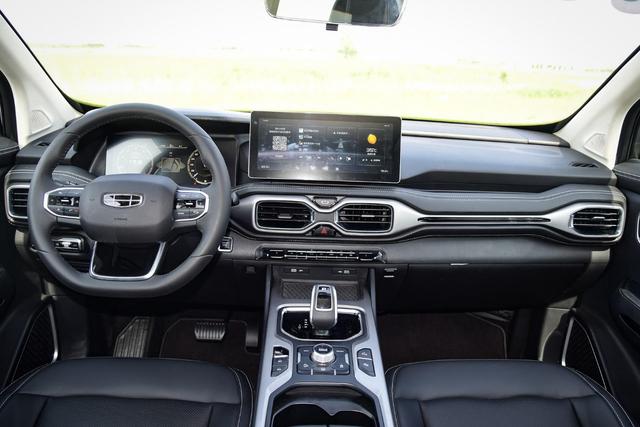 豪越自动舒适型同样延续在售车型,采用吉利最新的家族式设计语言,贯穿式设计的中控台与"∞"造型的空调出风口相互呼应,加上大面积软质材料的运用和细节,功能控制区的实体按键采用了钢琴按键式设计,整体内饰细节还是很有精致感。