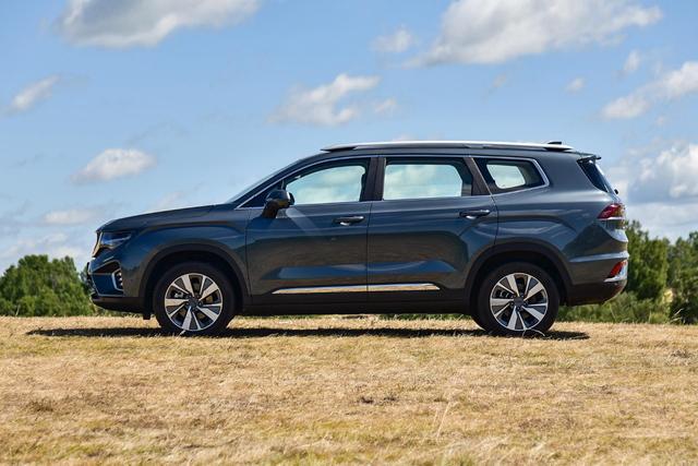 从侧面看,豪越的腰线比一般SUV更靠上,抬高了整车的视觉重心。车顶安装银色哑光行李架、车窗区域通过镀铬装饰条进行包边处理,让简约的车身设计并不会显得单调。