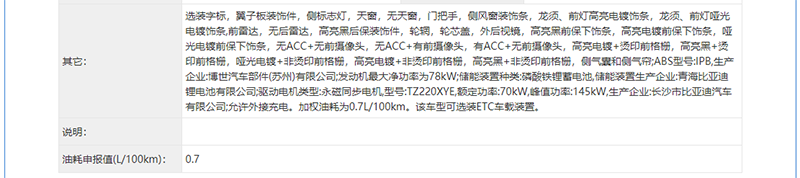 另外,申报信息还显示,新车将有两种功率的永磁同步电机与1.5L发动机搭配。其中低功率的电机峰值功率为132千瓦,加权油耗为1.2L/100km。高功率的电机峰值功率为145千瓦,加权油耗为0.7L/100km。动力电池上,新车将搭载磷酸铁锂蓄电池。