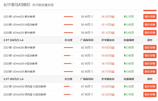 宝马X3指导售价:38.98-47.98万元,优惠幅度:5.76万元,奔驰GLC指导售价:39.78-58.78万元,优惠幅度:2.5万元。我们可以从它们的售价中得知,奔驰GLC顶配的价格要高于宝马X3,并且,优惠幅度也没有宝马X3大。