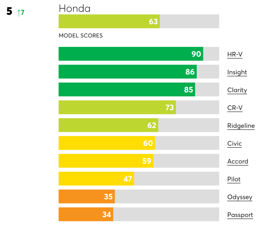 当然,有一些车型的得分我们觉得还是有些低了,比如Accord(国内为雅阁 (配置|询价))只得了59分,Pilot(飞行员)只得了47分,Odyssey(国内为奥德赛)只得了35分,所以希望本田在美国市场能够继续努力,获得更好的成绩。