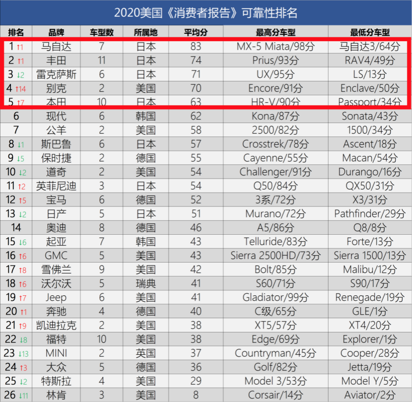 近日,美国《消费者报告》发布了2020年度最新汽车可靠性调查排名。作为一本已有84年历史的杂志,《消费者报告》是由美国消费者联盟主办出版,其创立的初衷则是想让美国的企业停止天花乱坠的产品宣传方式。可以说,美国的这本《消费者报告》在汽车领域的权威性还是很强的。另外值得一提的是,这本杂志至今也从未刊登过任何广告,所以由此可见该出版社是一家独立的非盈利机构。对于想要买车的美国消费者来说,这份报告也是能提供非常有价值的信息作为参考的。