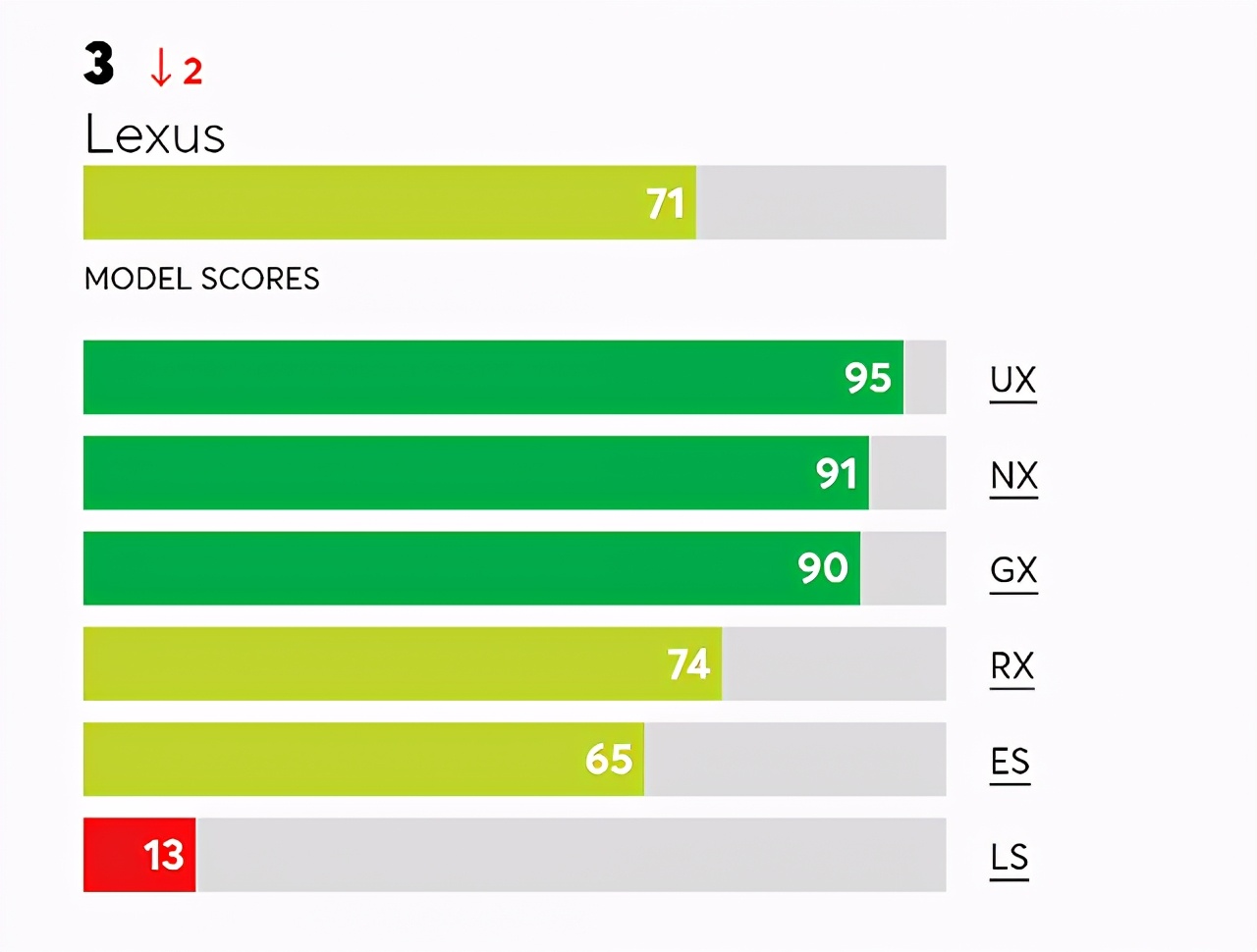 可靠性排名第三位的是丰田家的高端品牌雷克萨斯,作为一个常年“混迹”各大可靠性排名榜单前列的“选手”,雷克萨斯的质量确实也是经受住了全球市场的检验。在《消费者报告》可靠性排名中,雷克萨斯虽然只有6款车在北美销售,但是其平均分却得到了71分,因此它的整体表现确实也是可圈可点的。