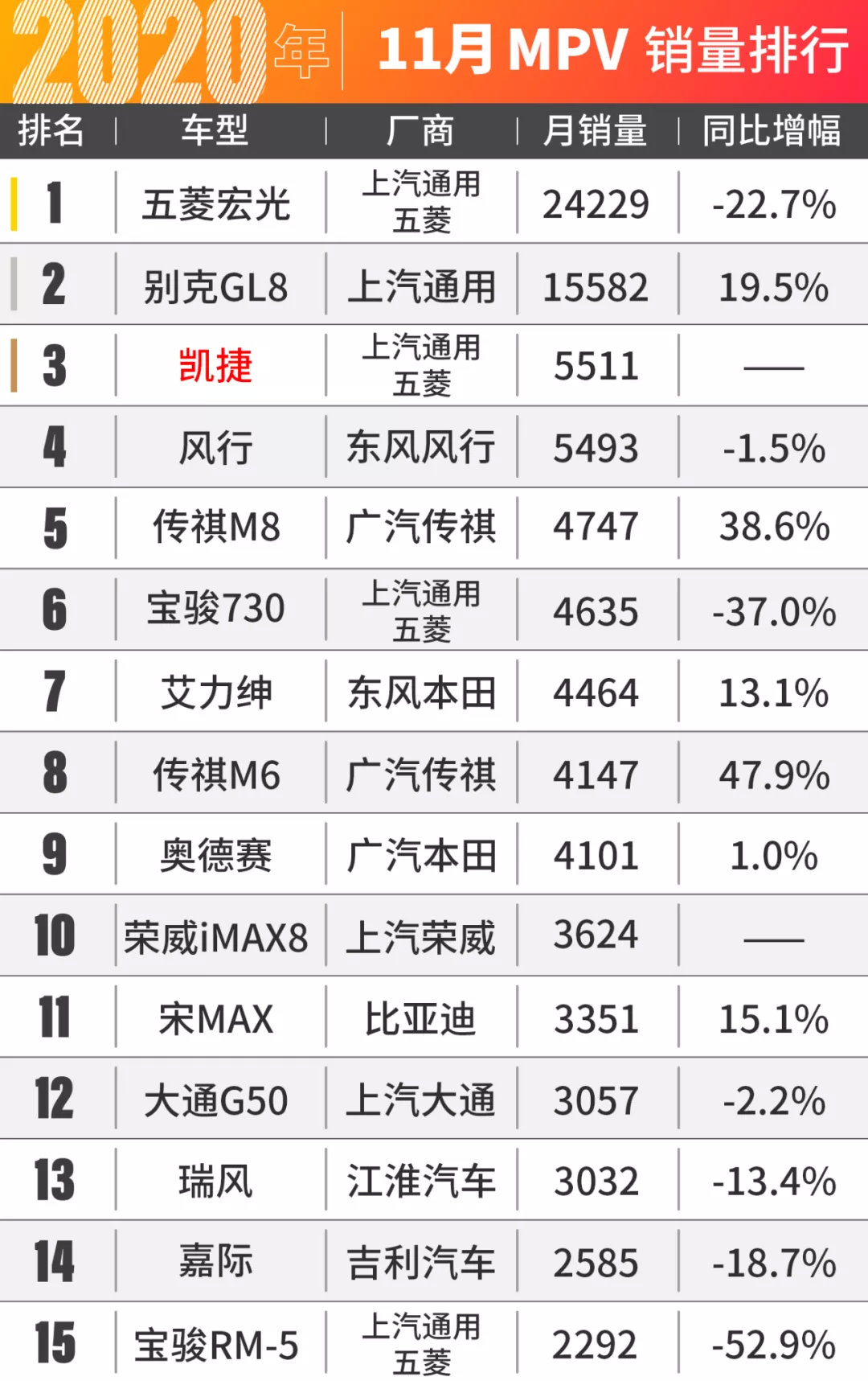 至于最稳定的MPV榜单,五菱宏光凭借2.4万台的销量再次获得了第一,而GL8也凭借既能高端又能平民的市场特殊性占据了第二位。但是11月MPV榜的第三位却来了一个全新的面孔......它就是五菱凯捷 (配置|询价)!