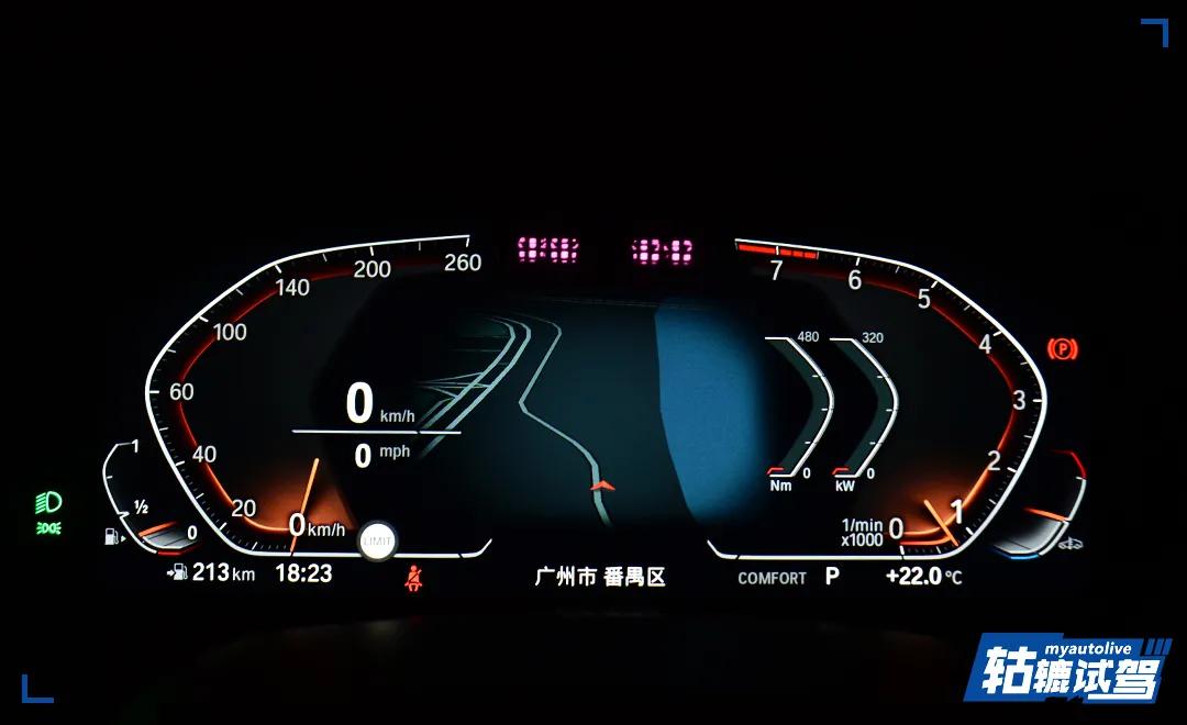 全车最精致的地方,毫无疑问是中控区。M方向盘手感细腻,握感粗壮。12.3英寸全液晶显示屏显示效果十分细腻出色,行驶参数直观,内容十分丰富。仪表盘上方的几个红点留意到了吗?先卖个关子,轱辘哥稍后揭晓。