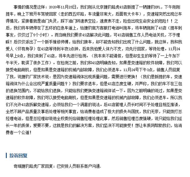 这位2020款捷豹XFL车主就反映,刚提车不久,车辆在行驶过程中,变速箱故障油门失灵速度表不走等情况,所幸的是好在人没有出事,关键是出现这样的问题,4S的态度真让人有所气愤,试问一下,人家车主当初买车的时候,你们也是这样的一幅面孔吗?为何寻求售后的时候就是如此之态度呢?难不成有两副面孔?这可是一台新车啊,如此品质,奇瑞捷豹路虎,难怪你降价都卖不动,毕竟,我们消费者还真不敢买这样有"品质"的车。