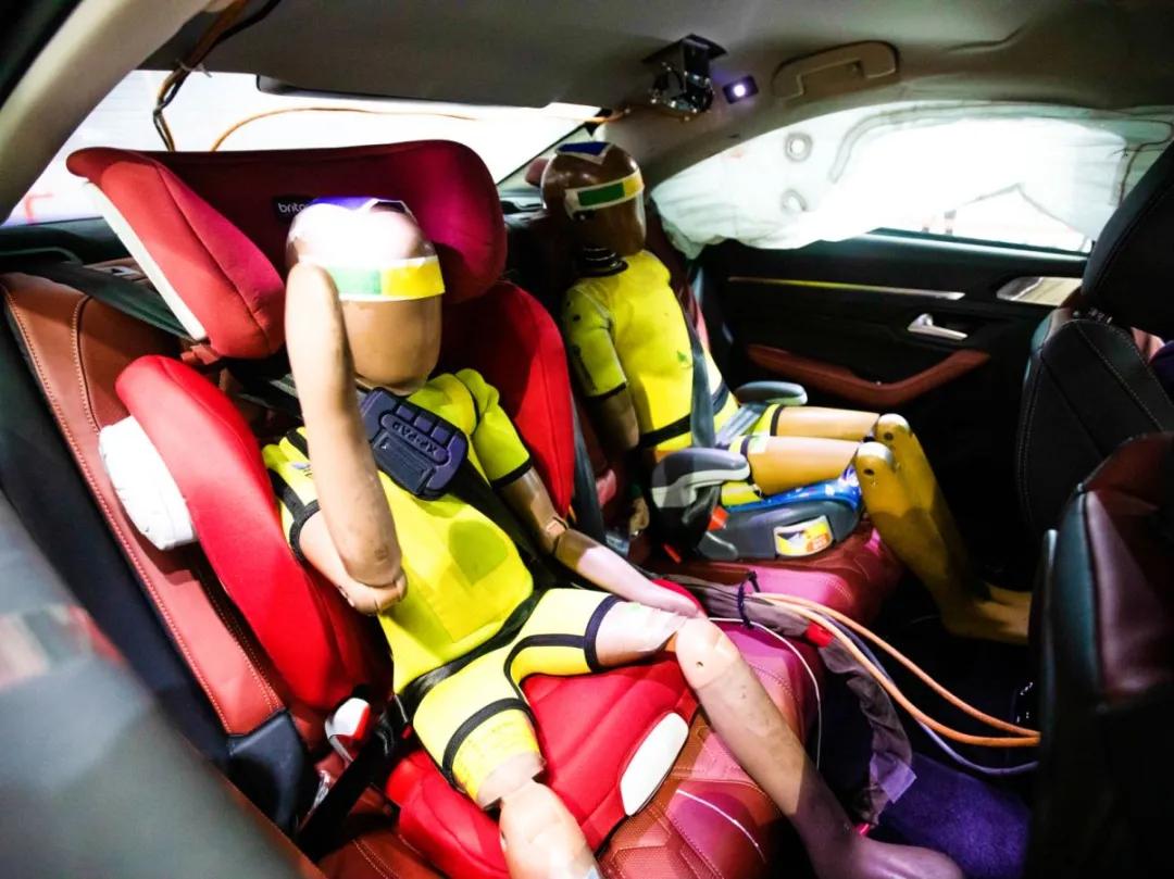 参考目前中保研C-IASI侧面碰撞测试,测试车上仅设置了驾驶座和后座左侧的假人。而此次中汽研的满载高速双向侧面碰撞则是设置了四个假人,达到满载效果。值得一提的是,测试中满载的设置还相当讲究,其中副驾为女性家人,后排为两名儿童,模拟了二胎家庭出行的真实场景。同时,满载碰撞还模拟了同排乘客头部相互碰撞导致二次受伤的“人体干涉”场景。