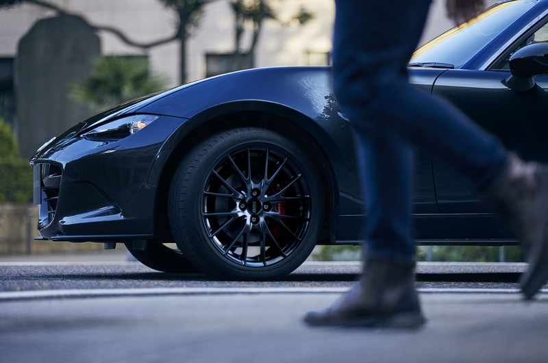 车身侧面,新车整体造型十分紧凑,符合MX-5车型一贯的小型敞篷跑车属性。其中,前后翼子板向外隆起,呈现出宽体造型,为整车带来了很好的力量感。此外,新车还配备了由BBS代工的多辐条运动风格轮圈,使得新车的运动氛围更加浓郁。