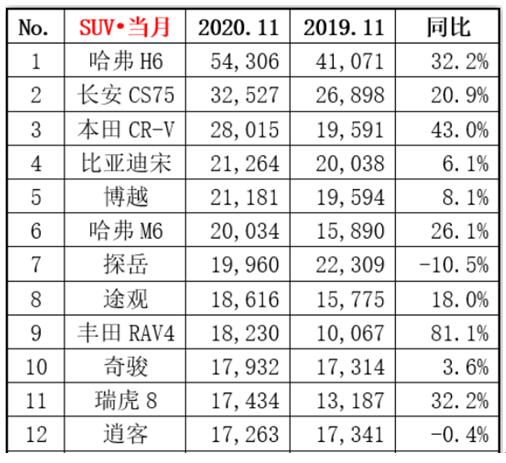 “技术宅”奇瑞在11月完成75319辆的销量,同比增长38%,是主流自主品牌中涨幅最大的一个。今年的6月份,瑞虎8完成2020款升级,销量也迅速提升,再加上10月刚上市的瑞虎8 PLUS助力,11月份瑞虎8家族一共售出17434辆,排在SUV销量榜第11名。