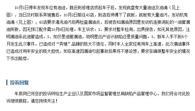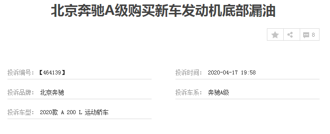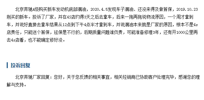 难怪不少网友质疑你,品质过硬的话,谁还会质疑呢?同样的问题,还有这一位2020款奔驰A级车主,表示还没来得及做首保,就发现车主漏机油,4S店更是表示,漏油是北京奔驰厂家的问题。大家请注意,这都是刚买的新车,并且都还没开多久,就有如此"毛病",可见北京奔驰的品质有多"敷衍"。