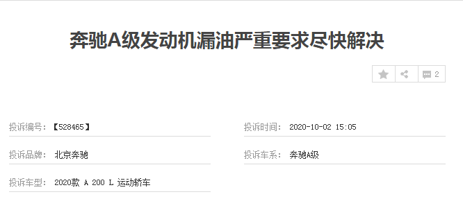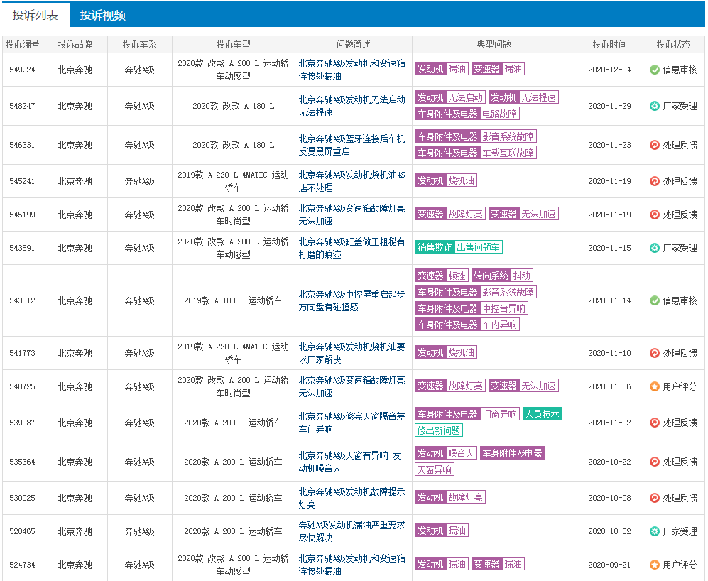 我们在看奔驰A级的一个投诉情况,发动机漏油和变速器问题成为典型问题之一,无论是之前19款奔驰A级,还是目前在售的车型,都有此类情况的发生,对于漏机油,小编倒是见怪不怪了,毕竟,这也算是北京奔驰家族旗下不少车型的"通病",既然是老毛病,就是不知道何时才能治好,都是知名豪华品牌了,实在是不应该。