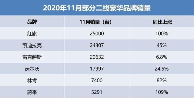 更关键的是,在11月份,红旗真正意义上迎来了它的"高光时刻",它以月销量25000台的成绩超过凯迪拉克、雷克萨斯的单月销量,一举成为二线豪华品牌的单月销冠。
