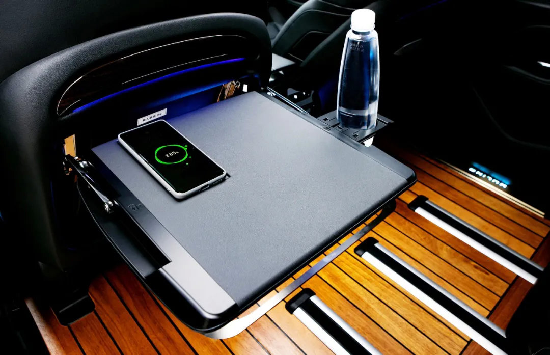 此外,定制版车型还在后排加入了两个可折叠的小桌板,造型十分精致,上方还有手机无线充电功能,右侧则是一个独立的杯架,可以保证杯子的稳定性。