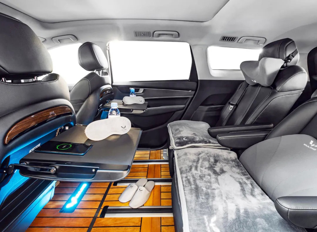 既然是定制版,那么新款车型在很多配置和设计上自然要更加高级才行。首先,定制版车型将第二排的权限放在了最重要的位置,地板采用纯进口柚木材质,与高级游艇类似。座椅也加入了颈枕、腰靠以及类似飞机上的毛毯等配件,甚至还有专属的拖鞋和眼罩。这种级别的配置,的确是飞机头等舱上才有的待遇。