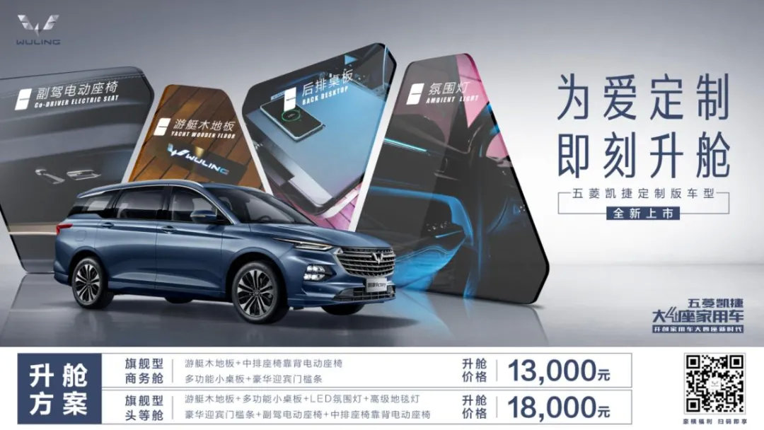 在刚刚过去的11月,五菱全新家用MPV凯捷卖出了5000多辆,迅速成为继五菱宏光之后又一款爆款MPV。不过,五菱似乎并不满足于凯捷现在的水平,于是推出了两款五菱凯捷定制版车型,这两款车型都是基于11.68万的顶配旗舰版升级而来,其中“商务舱”版本贵出1.3万元,达到12.98万,更高级的“头等舱”则需要加1.8万元,达到了13.48万。