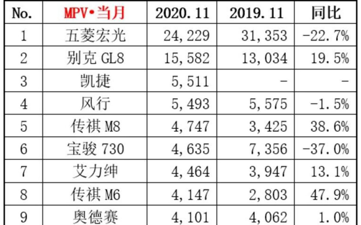11月份,别克GL8就以15582辆新车的销售数据成为了MPV市场销量的第二名,虽不及五菱宏光 (配置|询价)的24229辆新车销售数据,但五菱宏光更多的是主打低端MPV市场,所以从商用车角度来看,别克GL8就是该领域的销量霸主。此外,相比去年11月同期的13034辆销售数据,今年11月别克GL8的销量同比还增长了19.5%,而这无疑是相当恐怖的。