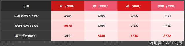 与第三代哈弗H6 相比,风行T5 EVO整体略小一些,其长、宽、高、轴距分别比第三代哈弗H6少88mm、6mm、40mm、23mm。