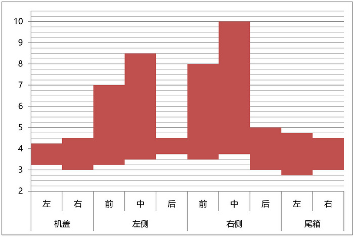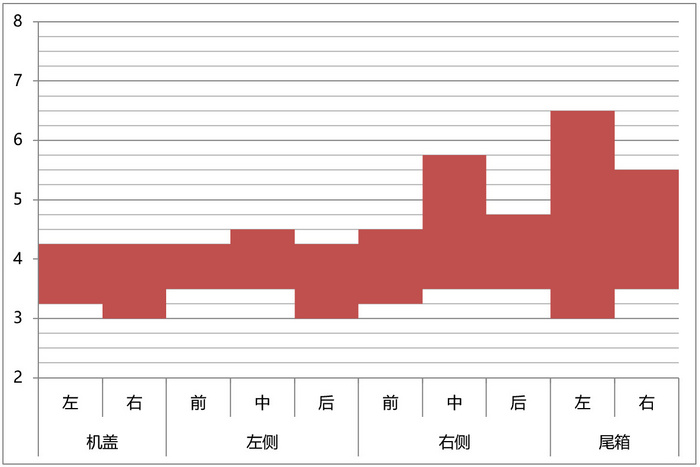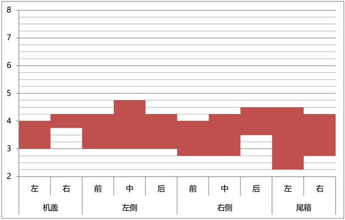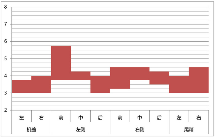 为了更直观地体现测量数据之间的差异,除了常规的数据表,我们引入了两张数据分析图,一张为各个位置测量数据的区间柱状图,体现每个位置测量值的波动情况,柱条越短代表该位置缝隙越均匀;第二张为所有测量数据的直方图和正态分布图,直方图体现数据出现的频率,正态分布图体现数据的集中程度。正态分布曲线越瘦高,代表数据集中性越好,也就是各个位置之间的测量值差异越小;同时从正态分布曲线的峰值的X坐标,也可以看出这台车四门两盖间隙的平均水平,X值越小,代表四门两盖的间隙集中值越小。最终排名时,优先评判数据的集中程度,也就是正态分布曲线越瘦高,排名越靠前;数据集中程度相近的基础上,再对比间隙的集中值大小,集中值越小排名越靠前。