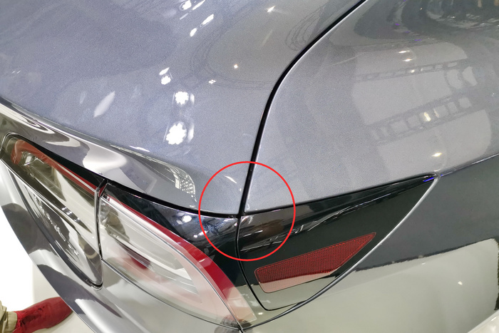 从上面的图片我们可以看到,小鹏P7的尾门接缝需要穿过上下两个灯具,下方的灯具还是一个角插入尾门的设计。按照我们的测量规则,下方灯具与尾门之间的间隙也要纳入测量范围,因为这和主观评价时的感受是相关的,而我们肉眼就可以看出来这个位置的间隙是明显是比其他位置更大的。