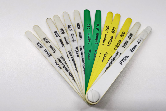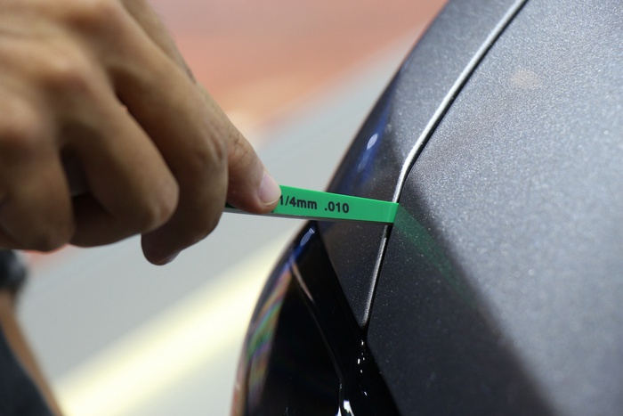 这次测量用的工具,还是整车厂常用于检测匹配间隙的塑料塞尺,有0.25mm、0.5mm、1mm和2mm四种厚度的塞尺片,塞尺的分度值为0.25mm,公差为5%,足够满足快速测量的精度要求,并且塑料材质不会划伤车漆。测量方法为组合不同厚度的塞尺片,塞到接缝中,测出接缝最小和最大的间隙值。