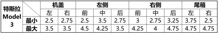 特斯拉Model 3的做工一直以来都饱受诟病,但是这次对比测得的特斯拉Model 3展车四门两盖间隙值竟然出乎意料的好,特别是在前机盖的部分,这台特斯拉Model 3展车真的是把接缝做得又小又均匀,左右对称也很好。同时,特斯拉Model 3的四门两盖间隙平均值还是6台车之中最小的。