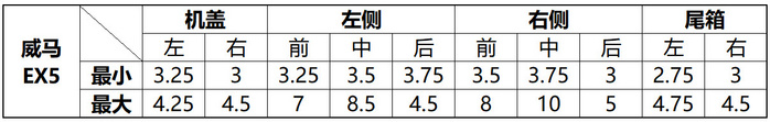 威马EX5表现垫底最主要的原因是塑料件之间的接缝实在是太大了,右侧门板中间的塑料件间隙达到了10mm,一个手指都能伸进去,而且左右相同位置测量数据偏差较大,对称差,门板下方的塑料件匹配基本处于失控状态。在钣金件匹配方面,前机盖和两侧车门前、中接缝表现不错,但是右车门后接缝又出现了间隙不均的情况,所以没有太多可以挽回分数的地方。
