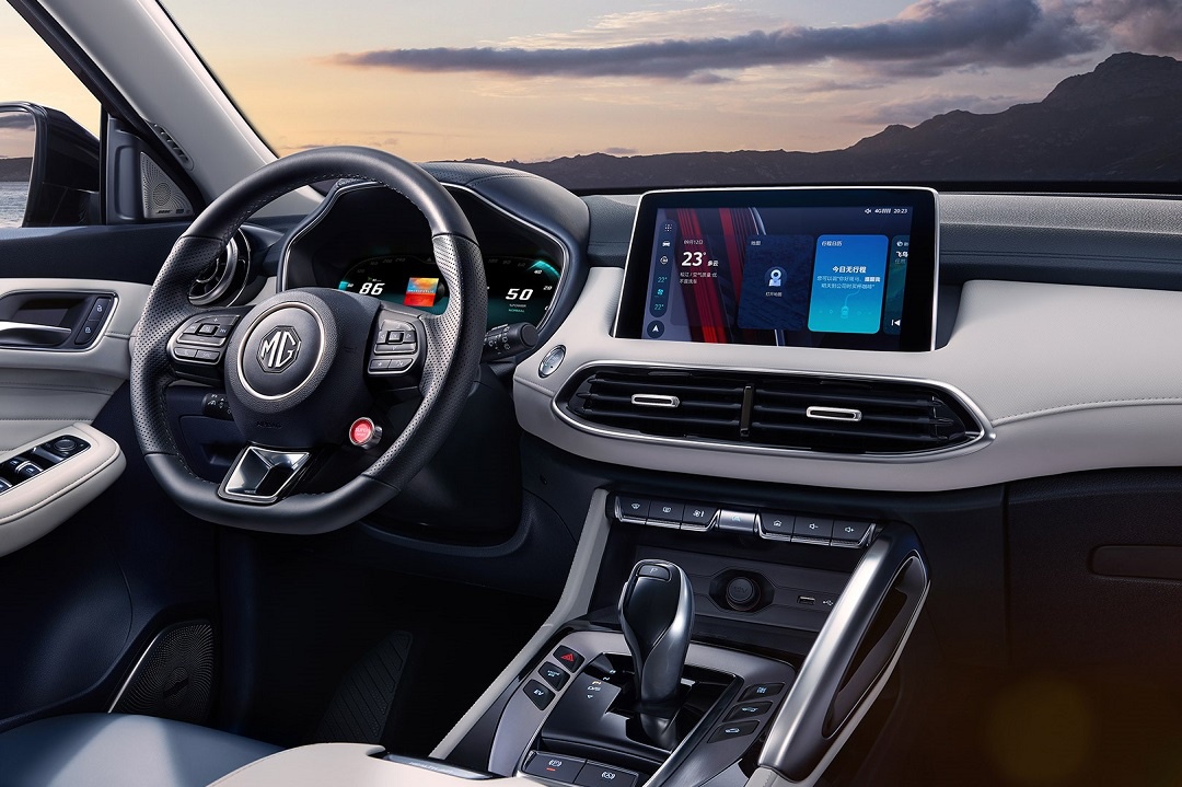内饰方面,MG领航PHEV同样与燃油版车型保持一致,其中中控台采用T字形布局,并以大面积真皮材质和软质材料覆盖,再搭配上蓝色和米色相间的配色方案,使得车内的品质感十分到位。MG领航PHEV的车内还配备了三辐式平底多功能方向盘,有效提升了车内的运动感。此外,新车还配备了12.3英寸全液晶仪表盘和10.1英寸中控屏,并搭载最新的斑马Venus智行系统,使得车内科技属性十分到位。
